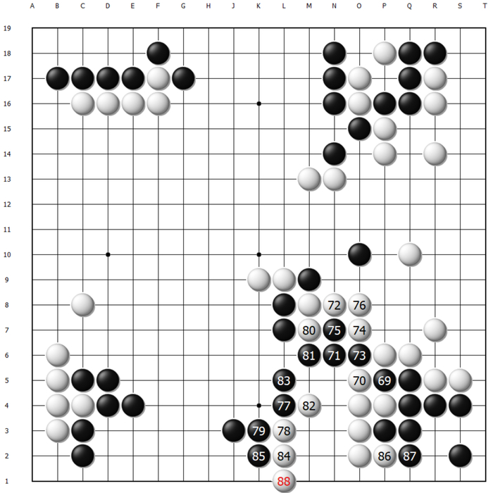 至于69和71的组合拳,可以说是这盘棋失利根本原因之一。这里申真谞的飞刺大概是忽略了对手反击的可能性,尽管看上去被分断后白棋十分凶险,但局部恰好能搭出两个眼位。