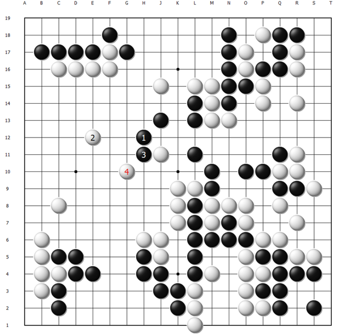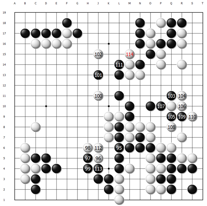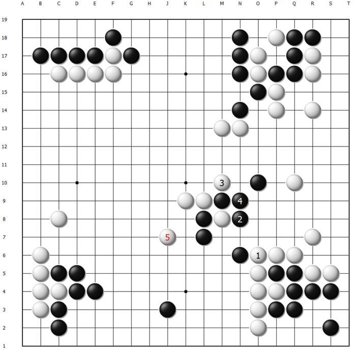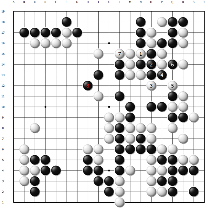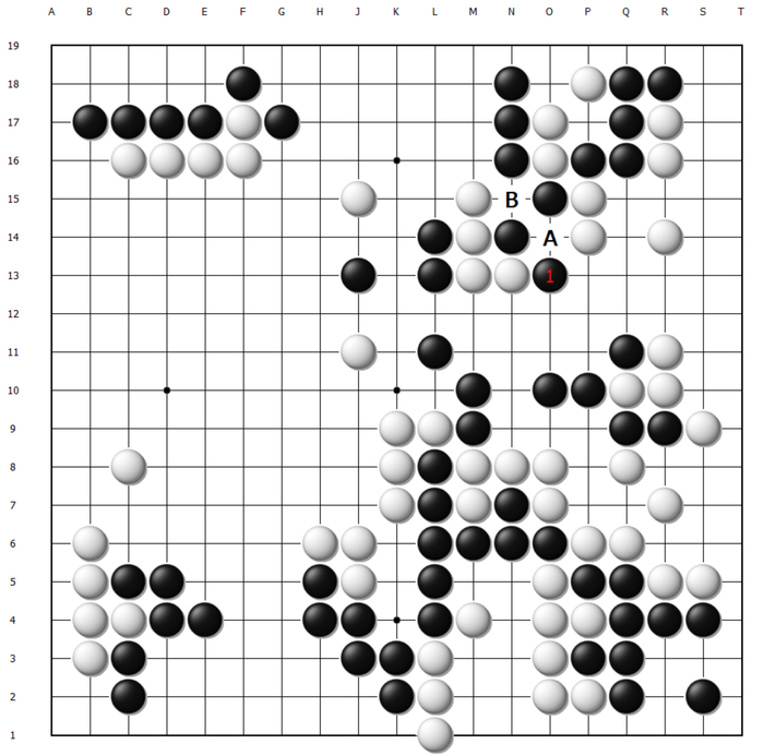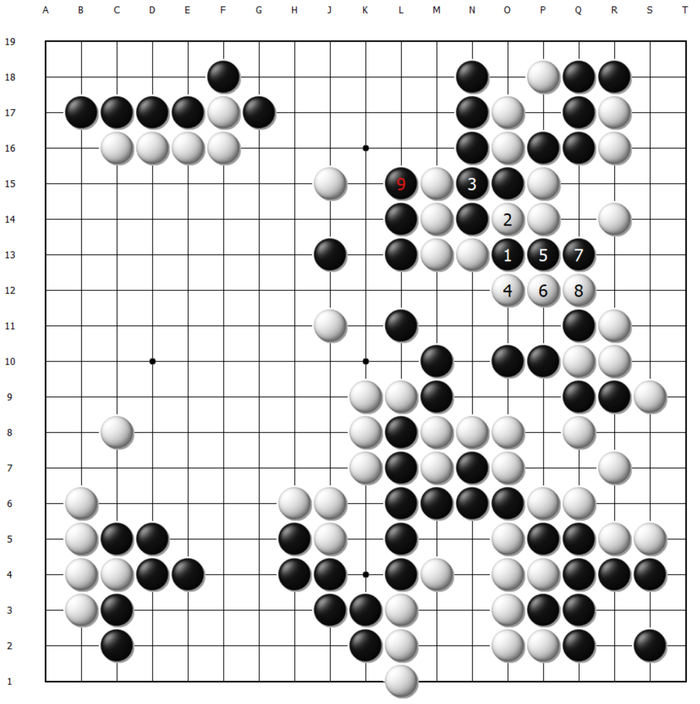 这样白棋顺势将一串先手交换,黑棋大龙岌岌可危。至130手,黑棋最后的机会同样是在O13扳出,可以说这盘棋失利的根本原因之二是申真谞始终忽略了O13扳出后的后续手段,以及给白棋制造麻烦的严厉程度。