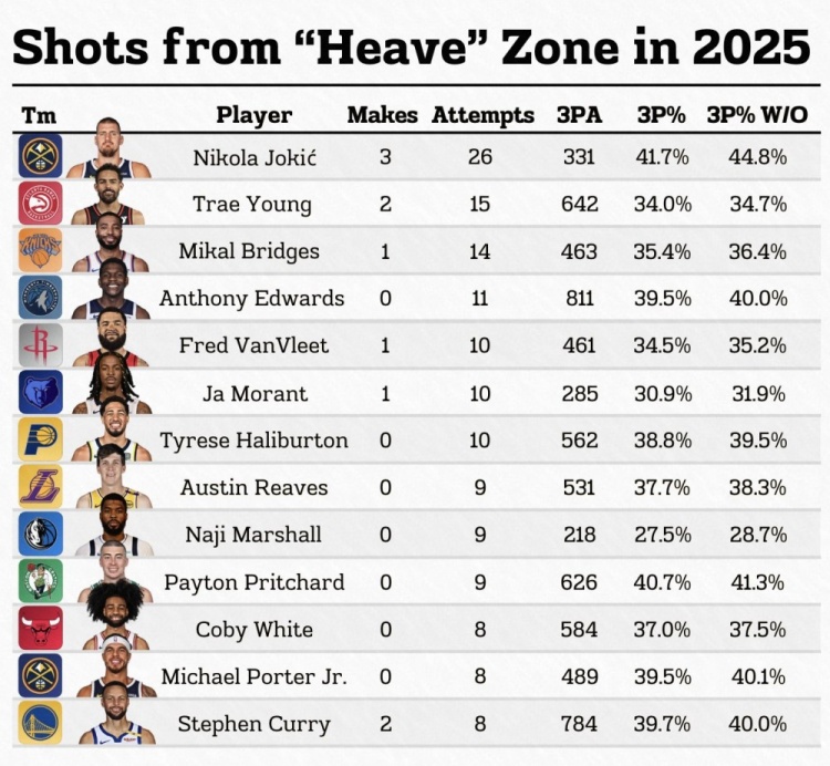 刨掉heaves出手上季三分圈会发生啥?约基奇🚀 库里又过4成👑